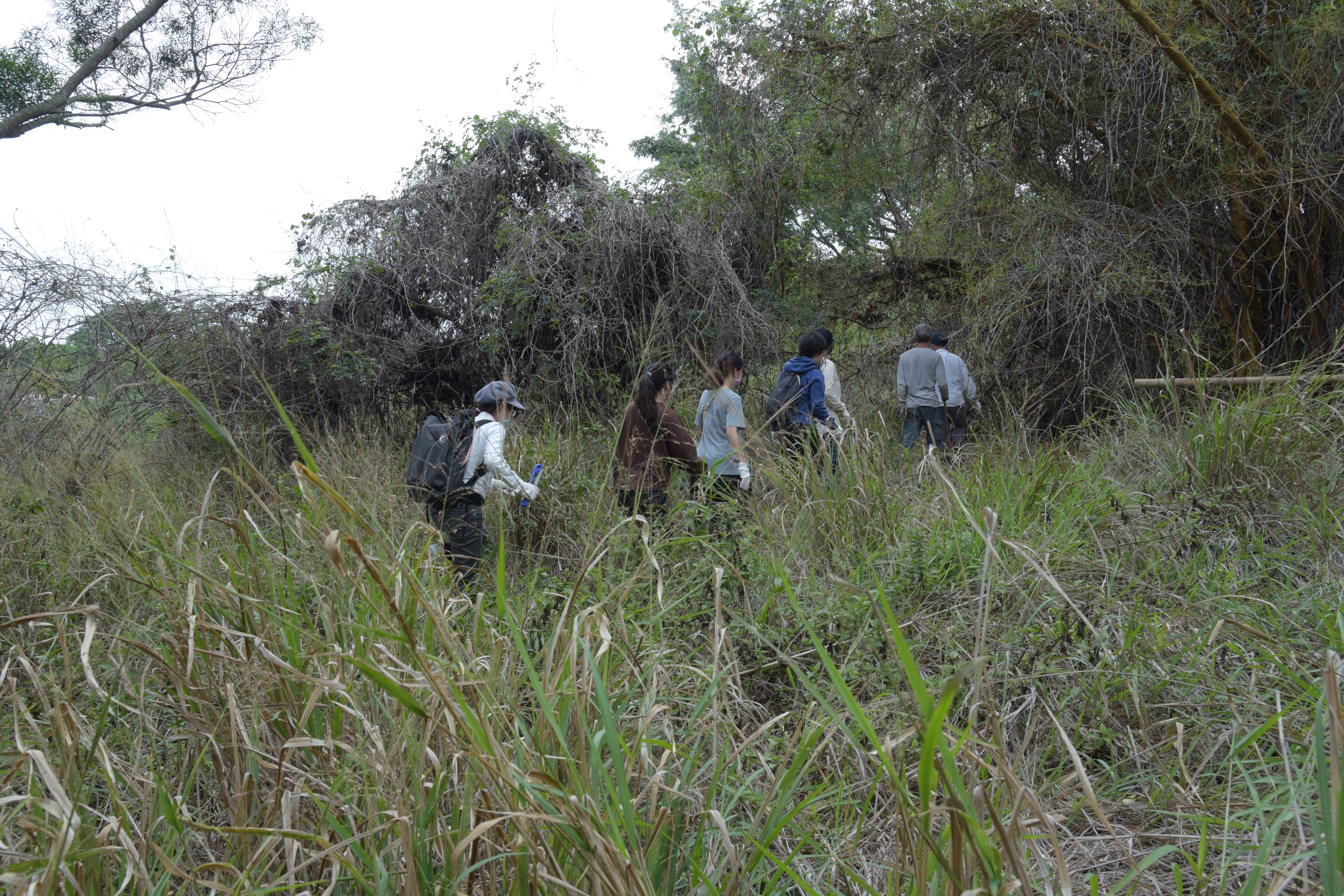 從火化場旁的竹林往下探路、穿越粗壯的七絃竹,首先見到的是搭給客人「打工換宿」的客寮,被大鄧伯花纏繞一地的鐵架;陸續見到灌溉用的水池、鳳凰樹。