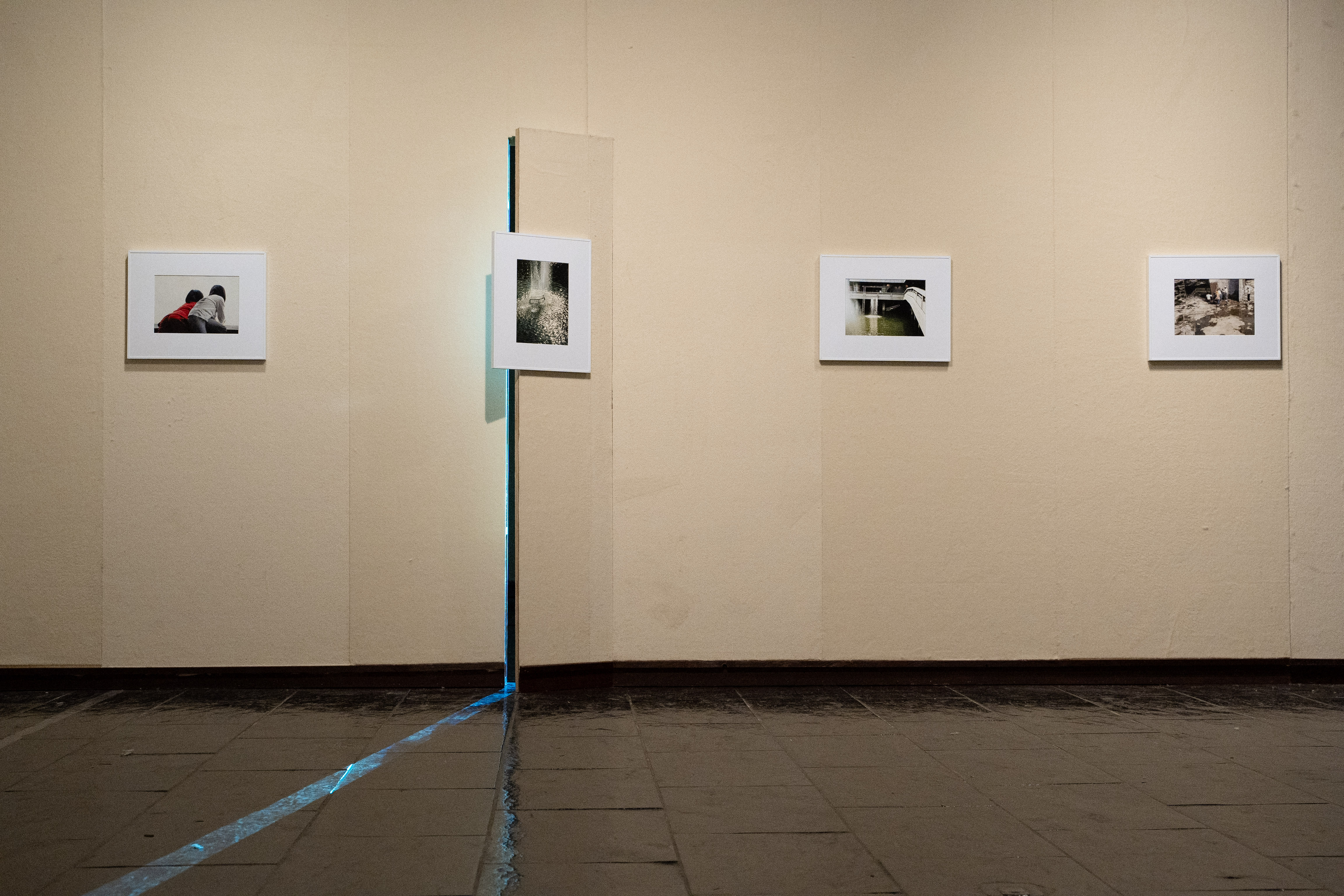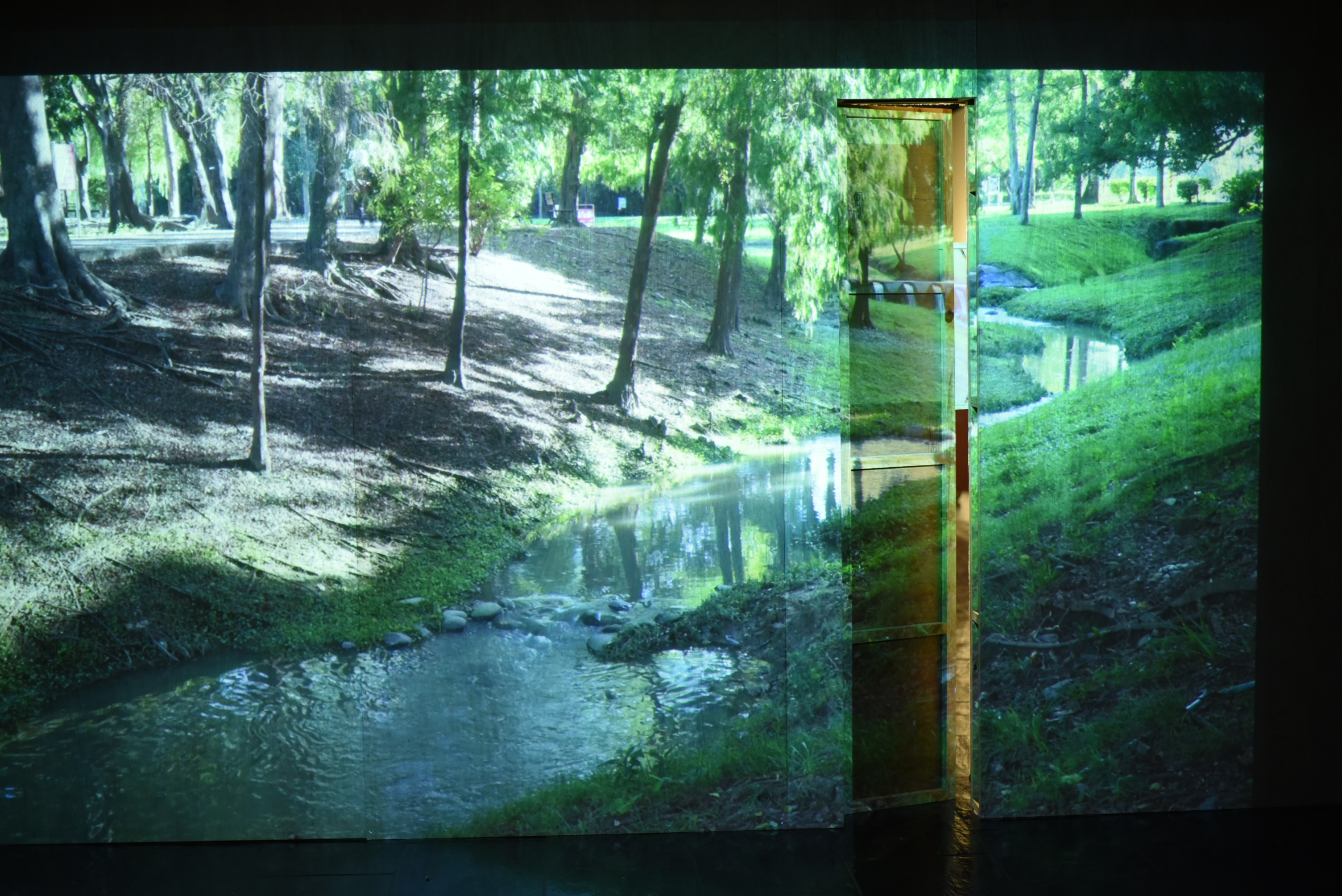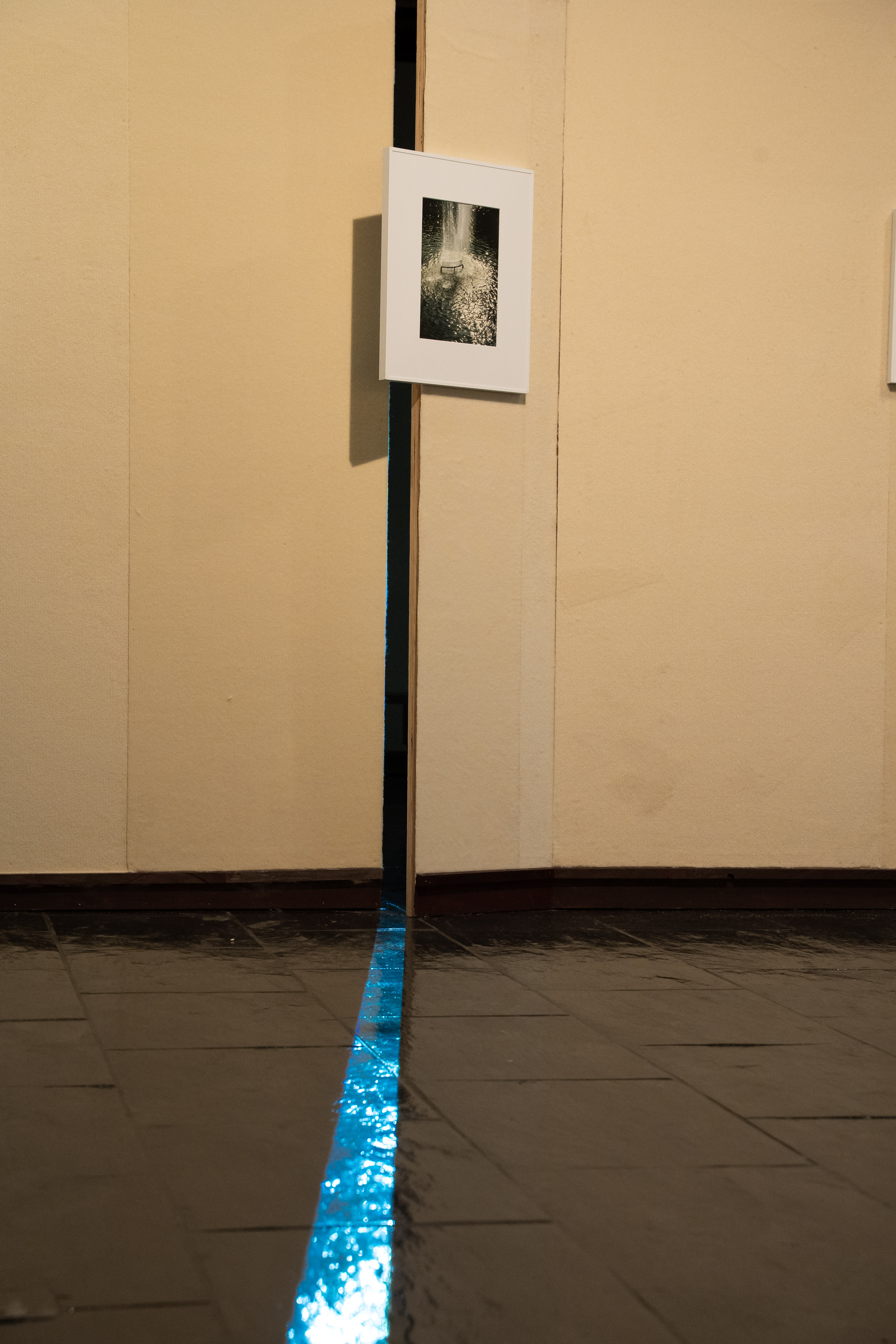 作品試圖從展場中打開一道,招喚觀眾穿越表層的入口。從縫隙間探問,來到文化中心,難以忽視的水池僅僅是景觀的設計,又或者是地形生產出的窪地?除了成為活動的容器,空間自身為何?牆壁的後面、地面之下是什麼?在看似平凡無奇的展牆上,濺起水面漣漪。